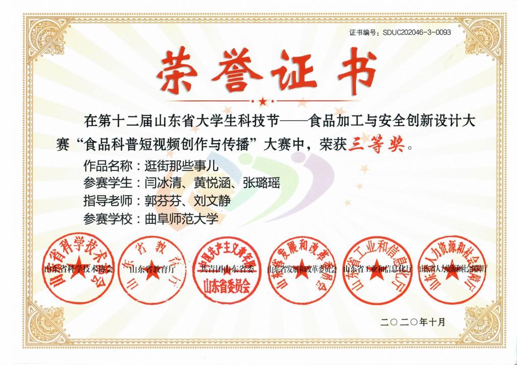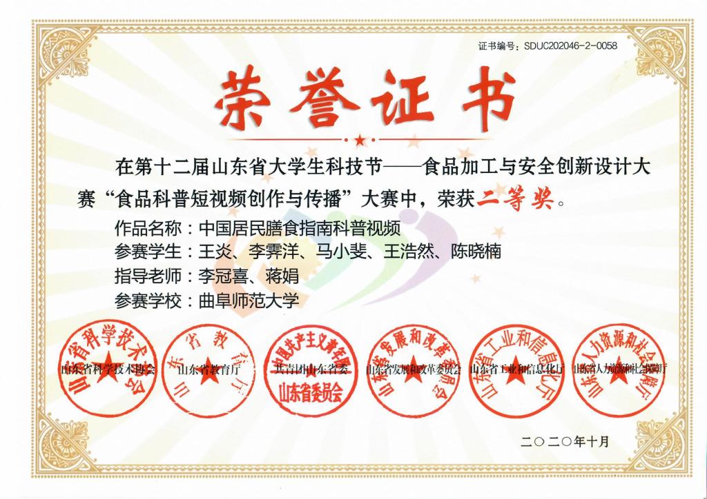 组建的5支参赛队伍共获二等奖2项、三等奖3项。其中,张梦琦等组建的团队获得食品加工与创新设计大赛二等奖;王炎等组建的团队获得食品科普短视频制作与传播大赛二等奖,张雨晴等组建的团队获得食品加工与创新设计大赛三等奖;陈晓楠等、闫冰清等组建的团队分获食品科普短视频制作与传播大赛三等奖。