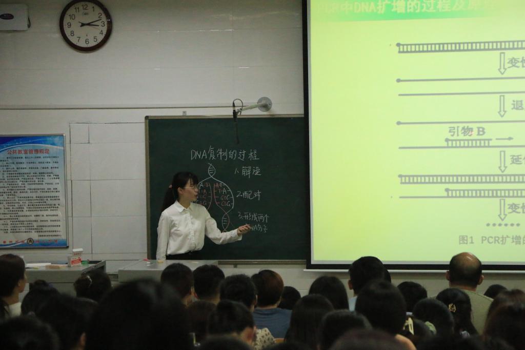 随后,由实习优秀学生代表进行教学展示,高中组代表高雅娟同学讲授了《DNA复制的过程》,初中组代表谭子笑同学讲授《组织运输的器官—血管》。两位同学以生动的语言、巧妙的设计、精彩的讲授展现了炸金花