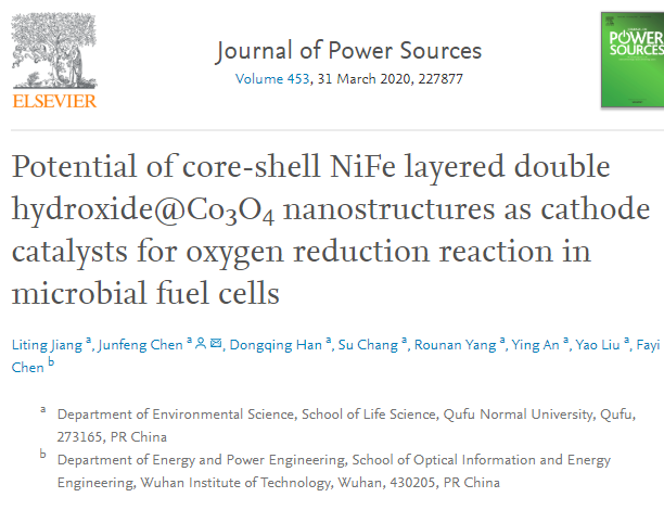 2017级环境科学班江丽婷,韩冬青,常素,杨若楠,安莹,刘瑶的研究论文(Liting Jiang, Junfeng Chen*, Dongqing Han, Su Chang, Ruonan Yang, Ying An, Yao Liu, Fayi Chen. Potential of core-shell NiFe layered double hydroxide@Co3O4 nanostructures as cathode catalysts for oxygen reduction reaction in microbial fuel cells. Journal of Power Sources, 453(2020)227877.)。该论文以炸金花