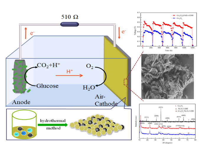 该研究采以NiFe-LDH为金属源,Co3O4为载体基质,在层状双金属氢氧化物(LDH)中掺入氮,制备了独特的核壳状结构镍铁层状双氢氧化物(NiFe-LDH@Co3O4)作为微生物燃料电池(MFC)的阴极催化剂,该催化剂具有显著的稳定性和耐久性,提高了MFC的产电性能,在催化氧化原领域具有潜在的应用前景。