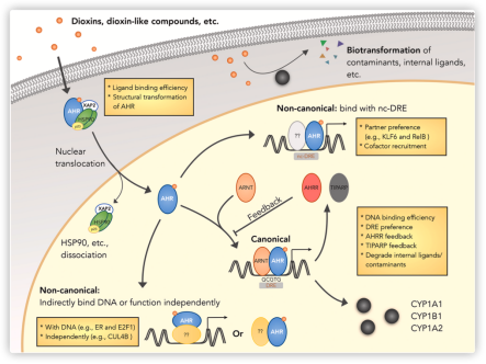 二噁英(dioxins)是全球关注的一类环境有毒污染物,被WHO下属的国际癌症研究机构IARC列为人类一类致癌物,是第一批被列入《关于持久性有机污染物的斯德哥尔摩公约》的物质。当前,不断有新污染物、化学品由于化学分子结构与典型二噁英的相似性,被鉴定出具有类似二噁英的毒理学效应,引起广泛关注,被称为类二噁英化合物(dioxin-like compounds,DLCs)。芳香烃受体Aryl Hydrocarbon Receptor(AHR),又称二噁英受体,是介导二噁英类物质生物毒性效应的主要、重要细胞内核受体。作为bHLH-PAS核受体家族的一个成员,具有6亿年以上的演化历史,在绝大多数后生动物中都有发现。其生物学功能主要是在受体-配体激活机制下,作为转录因子促进一系列药物代谢相关酶类的表达。