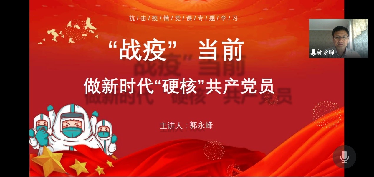 2020年7月8日下午,炸金花 教工党支部书记郭永峰为全体党员在腾讯会议上讲了题为“战疫当前,做新时代硬核共产党员”的党课。郭永峰围绕“透过战‘疫’的烽烟我们应当看到什么”、“对接战斗的过程我们应当做什么”、“直面未来的战场我们应该做什么”三个问题详细剖析了中国特色社会主义制度的优越性以及新时代共产党员的职责,切实提高了支部全体党员的“四个意识”、有效增强了“四个自信”。教工党支部全体成员参加了活动。