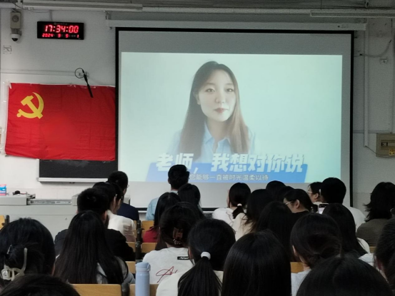 活动最后播放了学生党员们精心录制的感恩视频“老师,我想对你说”。视频中,学生党员们用朴实的话语、灿烂的笑容,表达了对老师们的感激与敬意,向老师们送上了最美好的节日祝福。一句句温暖的话语,一个个感人的画面,让全体党员感受到了作为教育工作者的价值和意义,也更加坚定了从教的理想信念。