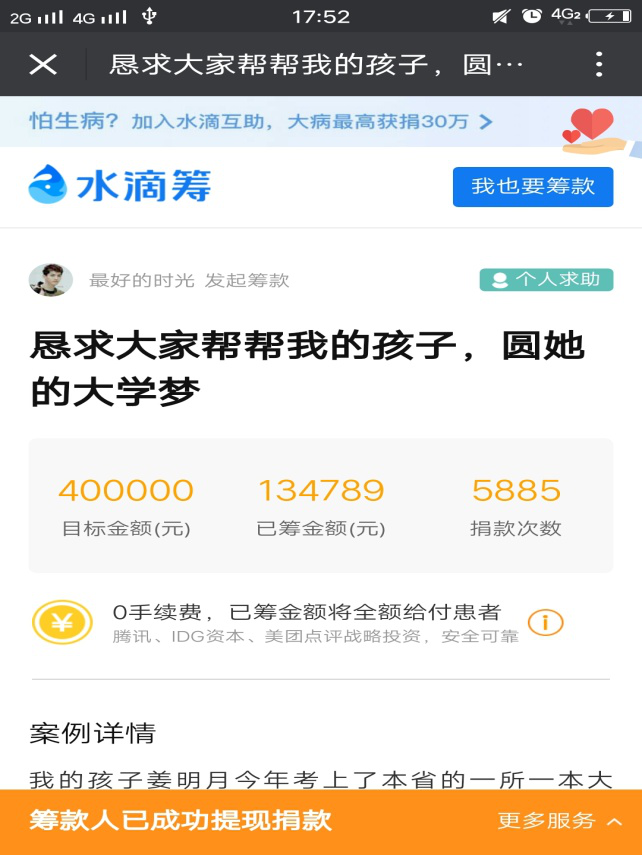 2017级新生姜明月在收到录取通知书后不久被查出患有急性淋巴细胞白血病,在当地医院进行初步治疗,随后转入北京医院进行骨髓移植,配型已找到,但高达四十万的治疗费使这个普通家庭陷入了困境,她的父母都是普通工人,前期治疗已经花光了家里的积蓄,家里没有额外的经济来源。
