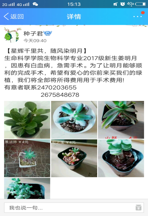 最终在大家坚持不懈的努力下,经统计现场募捐共筹得现金一万五千一百八十元,支付宝微信一万元,水滴筹由七万余元一直筹到十三万余元。我们已将筹款转给姜明月父亲,同时开展了后续的援助,一是进行绿植义卖活动,将义卖所得全部捐出,二是申报学生爱心基金,尽我们最大的努力帮助姜明月同学早日回到曲园。