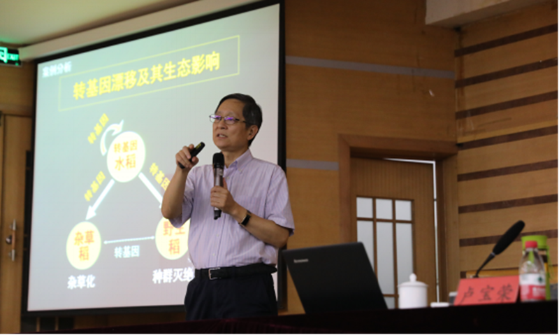 下午,卢宝荣教授从自身的实践经验和研究成果,理论联系实际,结合转基因生物技术的应用研究进展,以水稻为案例,跟大家分享了如何分析转基因漂移可能带来的潜在进化影响和研究转基因漂移可能导致的环境生物安全问题。卢宝荣教授在报告中提到,随着全球人口的不断增长,可耕种土地面积的不断减少,以及可利用农业资源的匮缺,全球的粮食安全面临严峻挑战。提高农作物产量来保证全球粮食安全,是育种家的重要任务。仅仅靠扩大耕地的面积以及靠更多的投入(如使用更多的化肥和农药)来提高农作物产量,在我国已经是很难做到,利用转基因生物技术为解决全球粮食安全的问题提供了一种新的选择。然而,全球大规模种植转基因作物,也引起了人们一系列的生物安全顾虑,包括食品安全和环境安全等。以此为背景,卢宝荣教授帮助大家从各个不同角度对转基因技术有了进一步的了解。报告结束后,卢教授和现场的师生进行了热烈交流,回答了师生提出的各种问题。