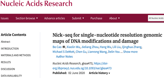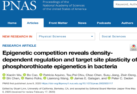 第一篇论文题为“Nick-seq for single-nucleotide resolution genomic maps of DNA modifications and damage” doi: 10.1093/nar/gkaa473),发表在《Nucleic Acids Research》上,曹博教授为第一作者与通讯作者,炸金花 为第一署名单位;第二篇论文题为“Epigenetic competition reveals density-dependent regulation and target site plasticity of phosphorothioate epigenetics in bacteria”doi:10.1073/pnas.2002933117), 发表在《Proc. Natl. Acad. Sci.》上,曹博教授为共同第一作者,炸金花 为共同署名单位。