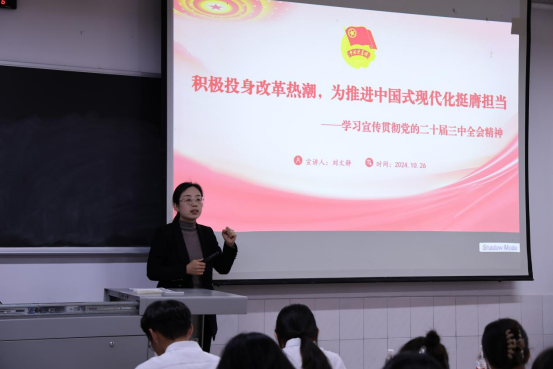团委书记刘文静以《积极投身改革热潮,为中国式现代化挺膺担当》为题作第一讲授课。她从“深刻认识全会的重大意义和主要精神”““改革引领青年,改革为了青年””“青年为推进中国式现代化挺膺担当”三个层面,深入解读了党的二十届三中全会精神的核心要义、进一步全面深化改革的必要性和总体要求,改革为青年创造机遇和发展空间,强调新时代青年应与祖国同频共振,与时代同向同行。作为青年大学生,要深入学习领会全会精神,坚定听党话、跟党走的政治信念,在推进强国建设、民族复兴伟业中展现青春作为、彰显青春风采、贡献青春力量,奋力书写为中国式现代化挺膺担当的青春篇章。