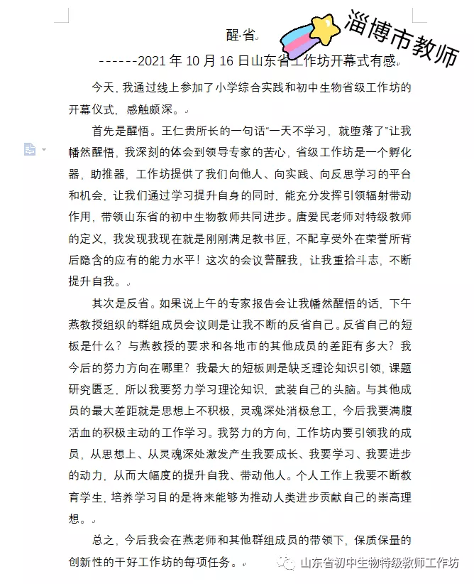 举行第一次研讨活动,研讨制定山东省初中生物学特级教师工作坊三年工作规划、工作机制、第一年度工作计划等。会议进行线上顺利、线下有序。来自省内各地区的教师们受益匪浅、感悟颇多,会议结束后纷纷表示意犹未尽并撰写了心得体会。