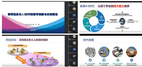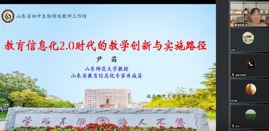 随后,尹苗教授讲解了智慧课堂生态系统的内涵及教学理论基础。尹教授从基础教育的现状调研出发再到山东考情的实际情况,通过生动形象的举例引导大家思考初中教师应当如何承担衔接小学、初中与高中的责任,切实培养学生面向真实世界的问题解决能力。在此基础上她详细介绍了智慧课堂生态系统的教学流程,从学习环境、学习资源及质量评价等方面分析了目前仍存在的问题及相应的对策。最后尹教授用“进窄门,走远路,见微光”,号召大家一起主动参与智慧课堂教学的改革。