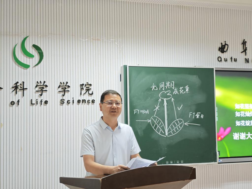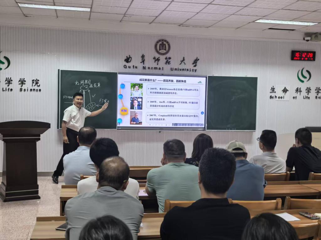 赵航老师以“光周期”为主题开展课程思政示范课展演。他采用新鲜花朵的实验导入新课,提出了“为什么不同的花会不同时期开放”“为什么我们现在可调控花开放的时间”等问题,启发学生思考,激起学生探究欲望。让学生在解决真实情境的问题中展开学习,继而通过“问题串”及合作讨论的学习方式让学生通过自主探究科学史来讲解新知,通过介绍最新科技前沿,进一步剖析光周期调控开花的机制,并通过我国科学家在这一领域的巨大贡献,将家国情怀、科学家精神等思政教育元素巧妙融入教学之中。